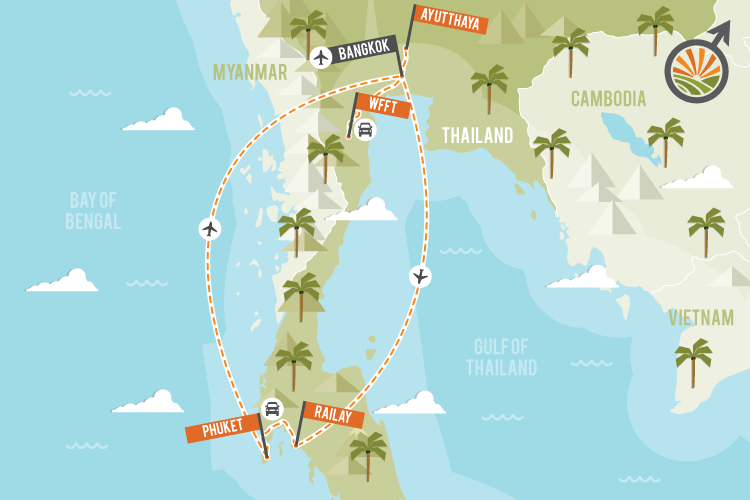 What's included? • All taxes • All land and sea transfers • 2 domestic flights within Thailand • Accommodations for your 12-day Detours experience • All full breakfasts • Group travel within Thailand • Full day Bangkok and temples day tour • Full day visit to local Elephant sanctuary • Full day trip to ancient ruins of Ayutthaya • Welcome dinner and drinks • Knowledgeable and fun Detours leader •