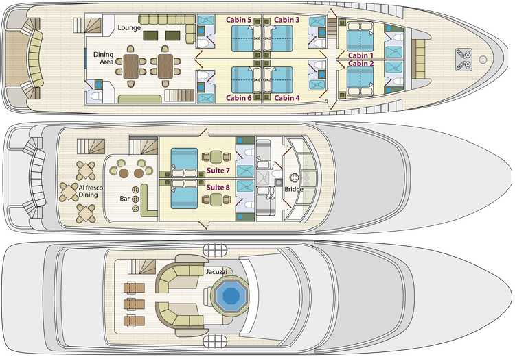 One of the newest and most beautiful first-class yachts in the Galapagos, having launched in 2023 after being built in the Netherlands. At 35 m long, it accommodates 16 guests in spacious suites and convertible cabins with panoramic windows. The ship features a Jacuzzi, Wi‑Fi, stabilizers, sun deck, and fabulous dining onboard - offering a luxurious and stable cruising experience through the Galapagos Islands. Check out the ship's full details here (We're using the '5 days C' itinerary).